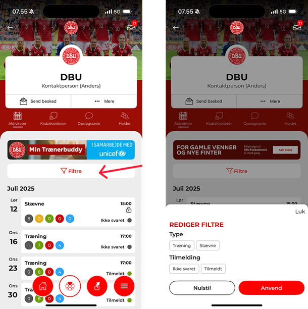 Inde på holdets KampKlar kan du se holdets aktivitetsliste. Det er muligt at filtrere listen. I filteret kan du filtrere mellem aktuelle aktivitets- og tilmeldingstyper.