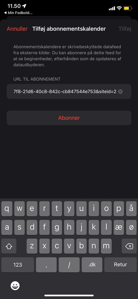 Efterfølgende får du et link, som du kan kopiere og indsætte i den kalender, du vil have - eller tilføje direkte til din enheds kalender ved at trykke 'Abonner'.