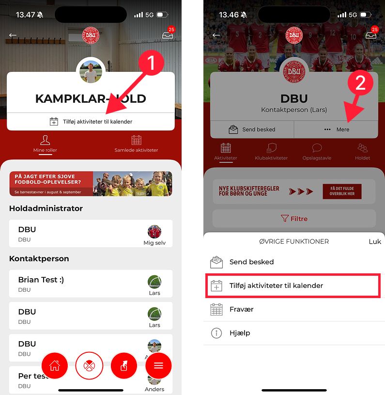 Hvis du har flere hold, vil du i stedet komme til siden 'KampKlar-hold', hvor du har mulighed for at importere aktiviteter fra alle dine KampKlar-hold ved at klikke på knappen 'Tilføj aktiviteter til kalenderen' øverst på siden (1).