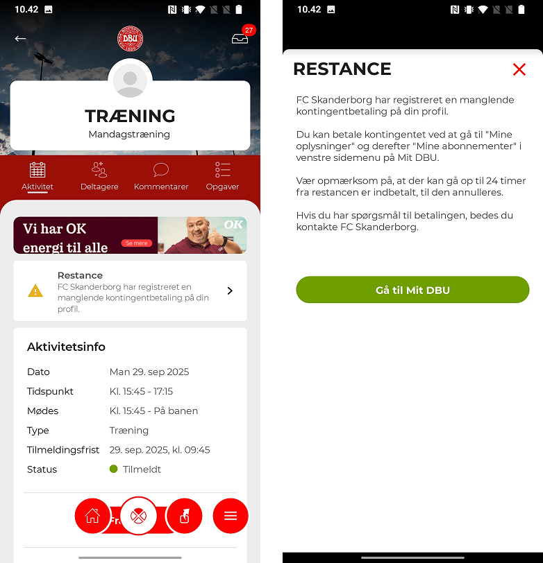 Hvis klubben benytter DBU’s løsninger til kontingentbetaling, vil du få en advarsel om manglende kontingentbetaling inde på dine KampKlar-aktiviteter. Advarslen orienterer samtidig om, at du kan betale manglende kontingentbetalinger via fanen "Mine abonnementer" på Mit DBU.