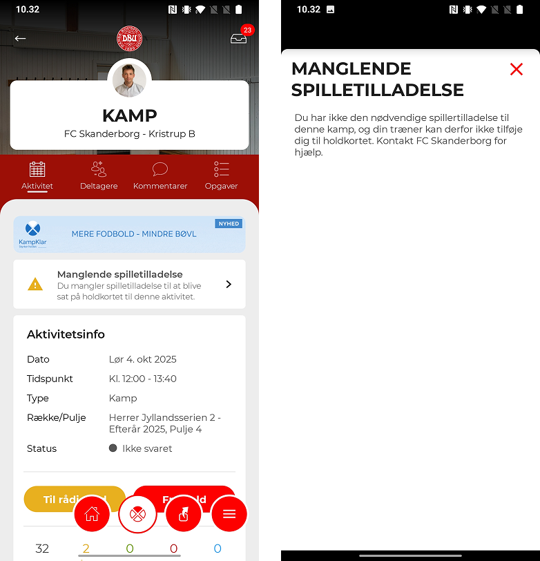 Du vil blive mødt af en advarsel under aktiviteten, hvis du: har en restance i klubben, mangler spillertilladelse til en kamp, eller hvis klubben har valgt at spærre dig fra at komme på holdkort.