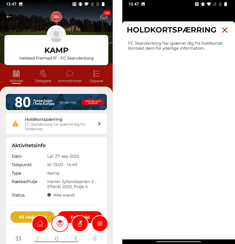 Hvis klubben har valgt at spærre dig fra at komme på holdkort, vil du blive oplyst om det inde på alle KampKlar-kampe.