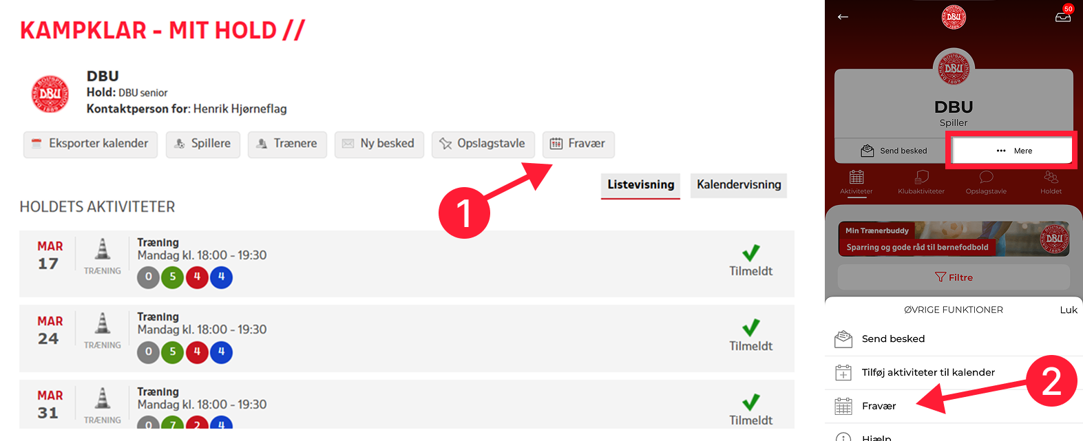 Fraværet oprettes fra knappen 'Fravær' på KampKlar-forsiden, som kan findes på forsiden på Mit DBU (1) og oppe i de tre prikker i højre hjørne appen (2).