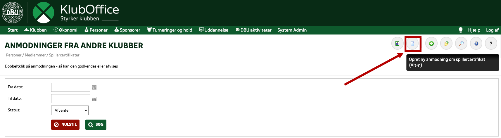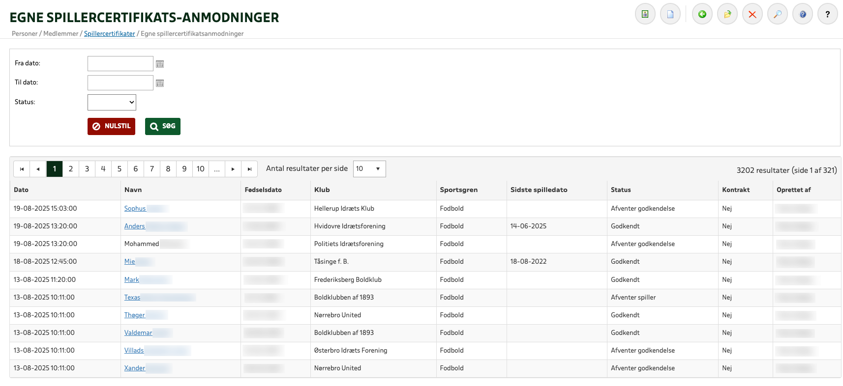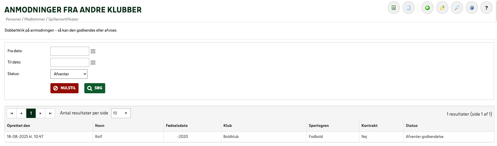 Det er her I skal behandle alle anmodninger fra andre klubber om at få overført et spillercertifikat på en af jeres spillere. Det er også muligt at se alle behandlede anmodninger ved at skifte 'Status' og trykke på 'Søg'.