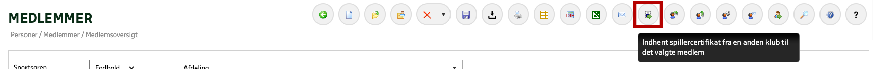 Du kan søge en spiller frem under medlemmer og markere denne - for så at vælge ikonet 'Indhent spillercertifikat fra en anden klub til det valgte medlem' i ikon-linien øverst til højre.