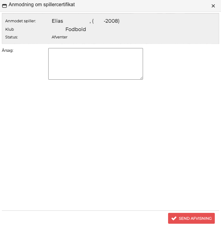 Derefter trykker I på 'Send afvisning', og personen der har oprettet anmodningen vil modtage en e-mail om afvisningen, og klubberne vil kunne se det i deres KlubOffice.