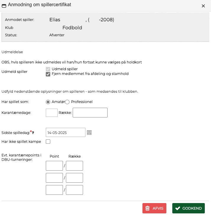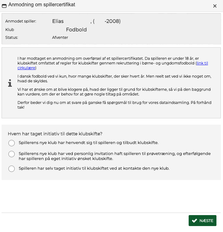 Hvis spilleren er under 18 år gammel, skal der i forbindelse med godkendelse af anmodningen svares på nogle enkelte spørgsmål, inden anmodningen endeligt kan godkendes. Du kan læse mere om klubskiftereglerne for børn og unge her: dbu.dk/boern-og-unge/klubskifte/