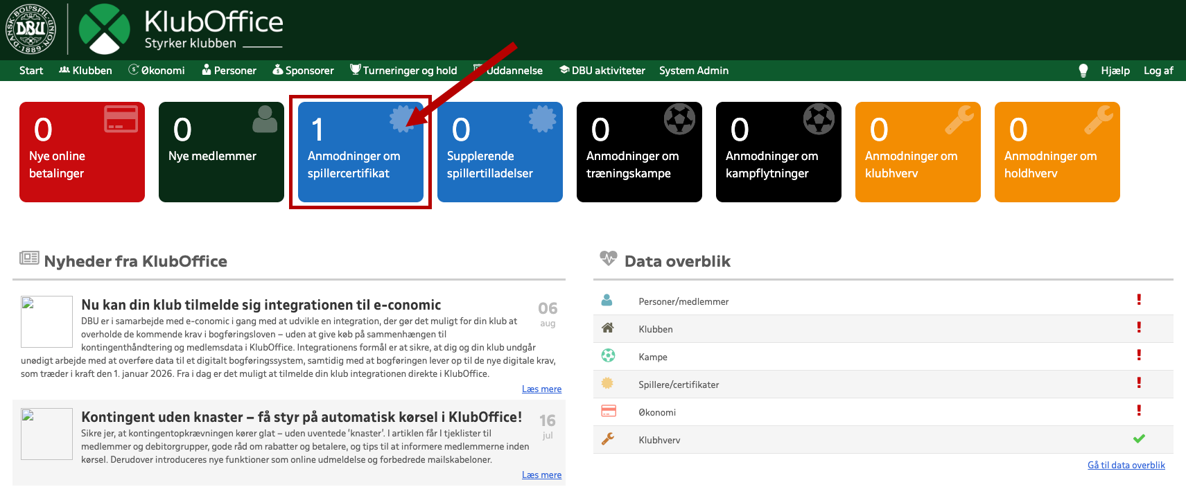 Spillercertifikats anmodninger håndteres fra ét fælles menupunkt i KlubOffice. Herfra kan man se anmodninger fra andre klubber, se egne anmodninger samt anmode om spillercertifikater hos andre klubber.