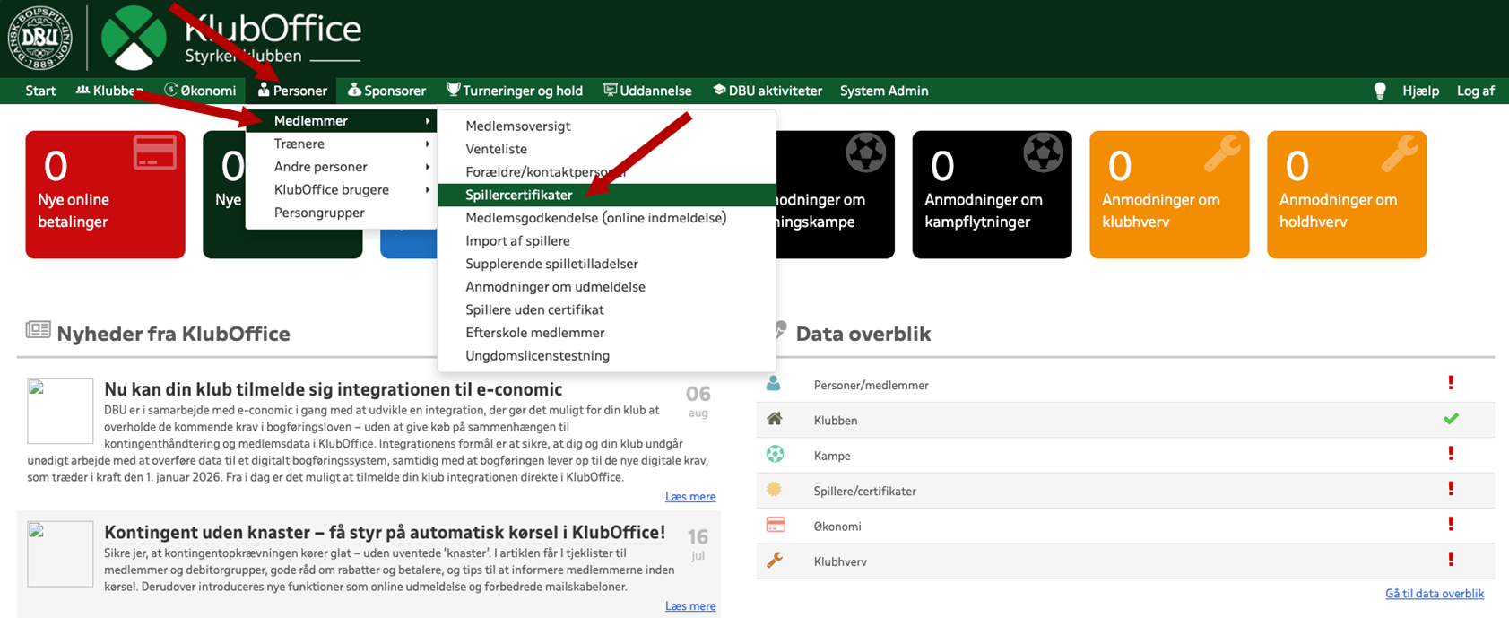 Menupunkt - "Personer" -> "Medlemmer" -> "Spillercertifikater"