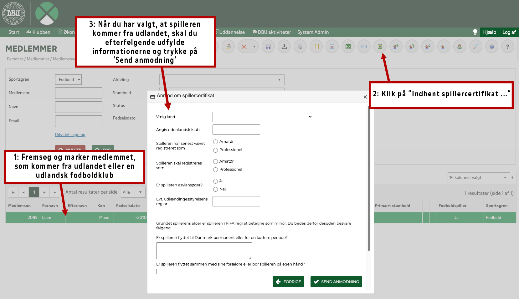 Er der tale om en spiller der kommer fra en udenlandsk klub, skal spilleren først oprettes som en ny fodboldspiller i klubben, og så efterfølgende ansøge om spillercertifikatet via medlemsoversigten som ovenstående.